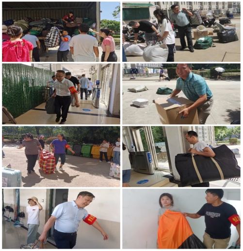 早晨,学院全体班子成员、全体辅导员和党员志愿者教师提前到位,他们深入学生宿舍指导、打包行李、搬运物品,副校长周端明、教务处副处长赵朋、后勤处副处长丁言浩身先士卒迅速加入志愿者队伍。汗水浸湿了全身,但灿烂的笑容依旧,老师们的言行举动让学生们深深感受到了阳光般的温暖。在老师暖心行动的感染下,搬迁完成的同学也迅速加入到志愿者行列,主动去为其他同学搬运较沉的行李,尽力为其他人减轻负担。大家团结互助,齐心协力,每一位志愿者都在用自己的实际行动默默付出,让劳累的搬迁工作变得温馨感人。