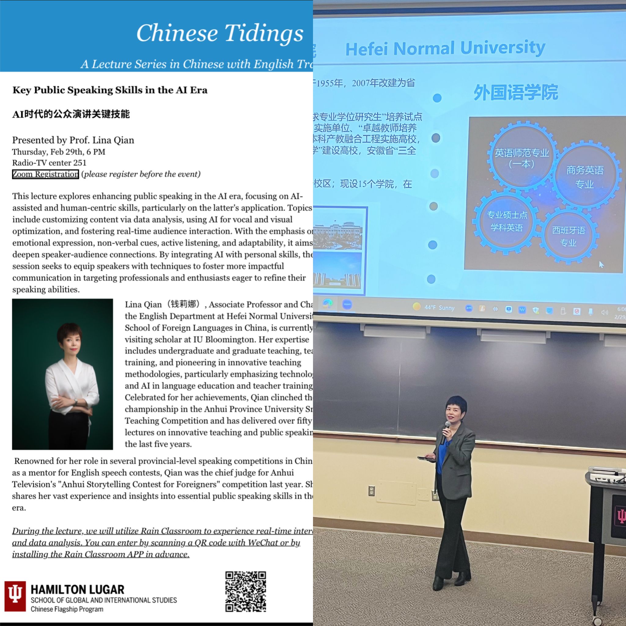 3月初,受美国印第安纳大学中文领航项目的邀请,万象城体育awcsportallwincity万象城副教授、英语系主任钱莉娜老师开展了一场题为“AI时代的公众演讲关键技能”讲座,印第安纳大学中文领航项目师生、其他学院的部分师生到现场参加讲座,同步进行网络直播,部分师生在线上参加了本次讲座。钱莉娜副教授在美国印第安纳大学的两位访学导师也到现场参加了本次讲座,他们分别是印第安纳大学教育学院Cur Bonk教授和语言技术中心主任寇晓静博士。