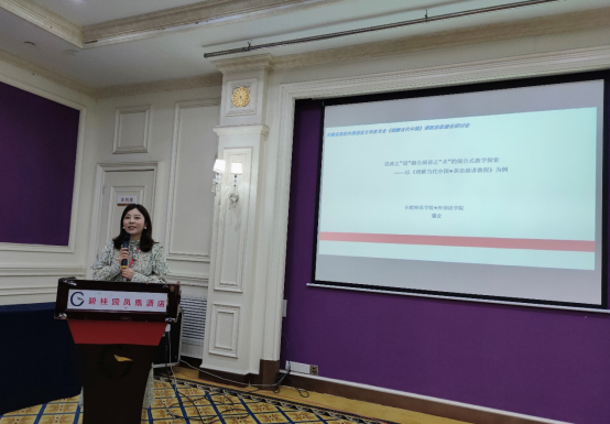 强云老师在分论坛做了题为“思政之‘道‘融合演讲之‘术‘的混合式教学探索-以《理解当代中国•英语演讲教程为例》” 的发言。她从思政之“道”与演讲之“术”的内涵,思政之“道”与演讲之“术”融合原因,以及思政之“道”与演讲之“术”融合方法三个方面探讨了成果导向、思政育人的混合式教学路径。