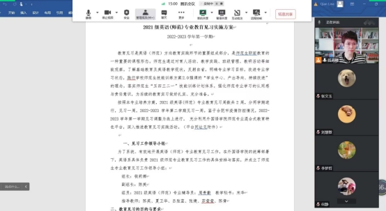 会议伊始,钱莉娜向同学们介绍了本次线上教育见习的流程,教育见习工作的领导小组成员以及教育见习的目的与要求。另外,钱莉娜为同学们详细解读了《英语专业人才培养方案》中关于教育见习的内容并强调其重要性。钱莉娜强调,在见习过程中要关注老师的教学方法,课堂提问及反馈情况,优质的线上学习平台可以给学生们提供丰富的资源,同学们可以向更多优秀的老师学习,取百家之长。陈英老师向同学们全面展示了线上教育见习资源,并给同学们解读了教育见习手册以及如何按要求完成手册。