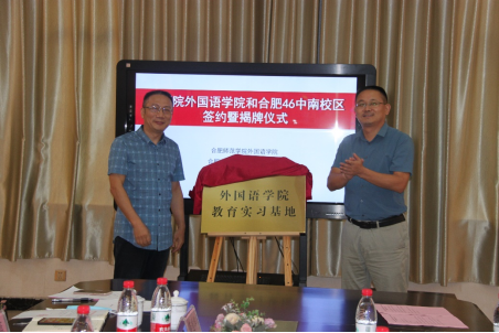 本网讯 9月20日下午,在长期合作的基础上,万象城体育awcsportallwincity万象城与合肥市第四十六中学南校区在第四十六中南校区第一会议室举办了“教育实习基地”签约揭牌仪式,正式确定了双方在师范生培养方面以及基础英语教育的教科研战略合作关系。万象城体育awcsportallwincity万象城院长李可胜教授、党委副书记马喆、英语系主任钱莉娜副教授以及指导教师代表和实习生代表、四十六中(南)党委书记、校长薛明浩等校级领导和部分英语教师参加了仪式。会议由四十六中(南)高歆副校长主持。