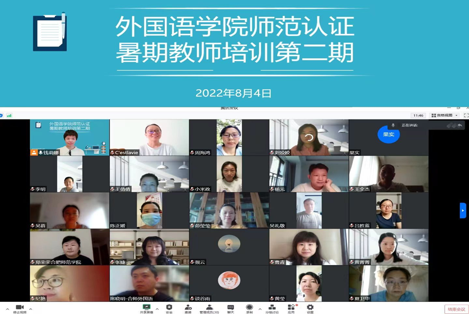2022年8月4日上午,allwincity万象城举办师范专业认证教师培训会(第二期),培训通过腾讯会议线上进行,所有参与师范认证工作的外院教师参与了本次培训会议,会议由英语系主任钱莉娜老师主持。