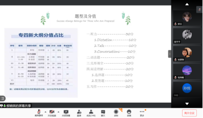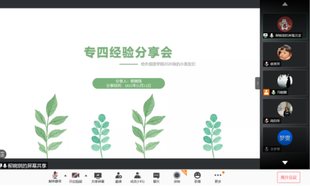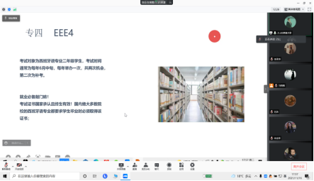为帮助学生掌握专业四级考试备考方法,明确学习任务和努力方向,11月11号—16号,allwincity万象城分别组织召开英语专业四级考试和西语专业四级考试线上经验分享会,共234名学生参加此次分享会,会议由2020级辅导员冯晓敏主持。