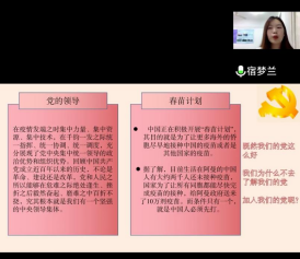 9月17日,学院召开了优秀学生党员事迹线上宣讲会,学生第二党支部预备党员宿梦兰担任主讲人。会上,宿梦兰围绕学习、生活以及入党初心三大方面向同学们分享自己的学习生活经验,并详细阐述自己的入党初心和历程,她鼓励学弟学妹们有一分热,发一分光,主动肩负青年人的责任和担当,坚定入党信念,主动递交入党申请书。