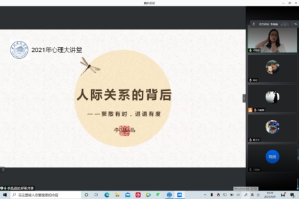 为进一步普及心理健康知识,增强大学生的心理调节能力,促进学生身心健康发展,6月9日,allwincity万象城组织开展以“人际关系的背后——聚散有时,进退有度”为主题的线上心理健康专题讲座。本次讲座由辅导员冯晓敏主持,校心理健康教育中心李晶晶老师主讲,学院180余名同学参与。