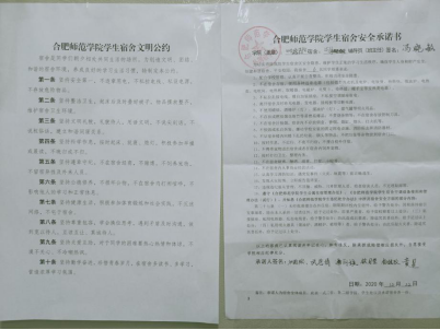 组织签名活动,推动安全入脑入心。学院各年级辅导员组织全体学生签订《万象城体育awcsport学生宿舍安全承诺书》,并安排学生将《万象城体育awcsport学生宿舍文明公约》张贴在宿舍墙上,各年级学生纷纷参与进来,通过签名活动来践行自己的安全承诺。