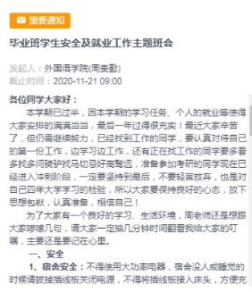 毕业班辅导员苏珊老师从住宿安全、出行安全、财产安全、饮食安全及预防电信诈骗等方面普及安全常识,强调安全意识,2017级外出实习班级通过班级群消息及网络会议等形式,在强调基本安全的同时,也提醒同学们防范实习过程中的安全隐患,平安充实地度过实习期。