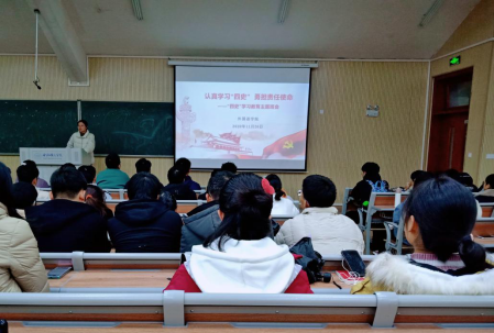 冯晓敏主要从学习“四史”的原因及重要性、关于开展“四史”学习教育工作方案和活动的通知以及“四史”学习教育竞答攻略三方面展开讲述。会上,冯晓敏首先介绍了“四史”的含义,并通过播放视频短片的方式让同学们感受全国各省学习“四史”的热情氛围。并详细介绍学习四史的重要性,让同学们理解中国共产党为什么“能”,马克思主义为什么“行”,中国特色社会主义为什么“好”,她鼓励学生在学习“四史”中明确答案,坚定信念。