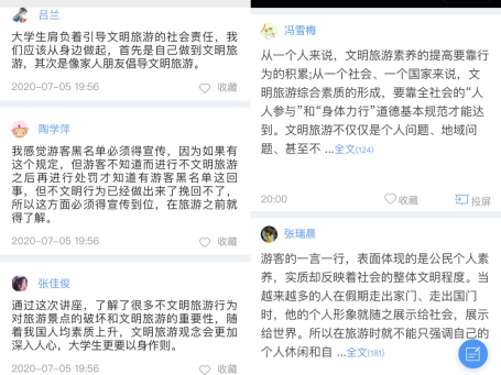 讲座上,同学们纷纷投稿表示对文明旅游重要性和原因有了更深更广的认识,会践行文明旅游和文明旅游的宣传员。本次讲座将应用型人才培养目标与我国旅游业转型升级相结合,理论联系实际,收到了预期的效果。(allwincity万象城 李慧)