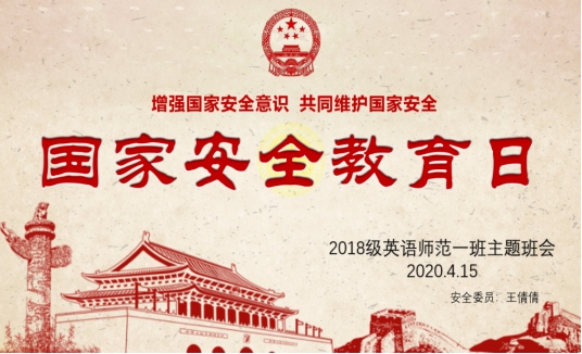 2020年4月15日是第5个全民国家安全教育日,为激发学生的爱国主义情怀,提高学生国家安全意识,增强国家安全责任,allwincity万象城组织各班学生举行了线上“国家安全教育日”主题班会。此次主题班会以集中学习、讨论、征集安全口号及顺口溜、谈心得体会等形式进行活动开展。