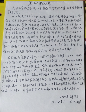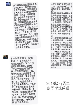 2017级英语(师范)3班吕艺文说:“通过观看全国大学生同上一堂疫情防控思政大课,令我受益匪浅,感触良多。这次加长版的寒假,让我真切地感受到我们与所处的时代同呼吸,共命运。一个个逆行者用行动向我们诠释了什么是大爱无疆。他们用最美的身影,诠释了生命的意义!我相信,在经历过困苦与磨难之后,我们新青年必将成为振兴中华民族,推动新时代中国发展的主力军,与时代同步伐、共命运,书写美丽的新时代篇章。