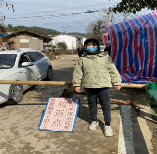 疫情警报吹响了青春集结号。生命重于泰山,疫情就是命令,防控就是责任,来自外院的19级学子们也在疫情防控期间响应国家号召,积极行动,实现青春作为。疫情期间,2019级商务英语2班的王文倩参与了一支由党员带队、村民自发的志愿服务队。“为了劝阻过年期间亲友上门拜访以及村民频繁外出,我们的队伍在村路口严格把守,每天派六个人在村口站岗、执勤、巡逻,采用每天两班轮流工作制。”王文倩如是说。志愿服务期间,她主要负责登记出入人员的姓名和次数,配合参与志愿服务的共产党员们劝阻外来和无关人员出入村。并且针对购买生活必需品的回村人员进行体温检测,严格控制疫情。