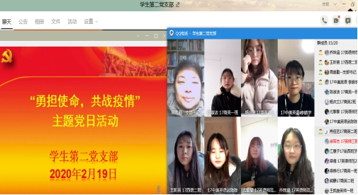 为切实强化疫情防控工作,切实发挥党支部战斗堡垒作用和党员先锋模范作用,在疫情防控阻击战的关键时期,allwincity万象城学生第二党支部于2月19日下午线上开展“勇担使命,共战疫情”主题党日活动。本次党日活动由学生第二党支部书记周贵勤老师主持开展,支部党员参加。