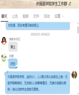 三、坚持全过程,全程联系动态掌握师生每日信息。疫情防控工作开展以来,allwincity万象城要求全体学生管理队伍守岗履责,采取线上模式,坚持人盯人工作方式,全天候24小时在线,全程摸排,动态掌握学生信息情况。特别是那些到访过重点疫情防控地区、与重点疫情防控地区人员或确诊病例有接触史的学生,询问他们的每日状况,安抚他们的焦虑和紧张情绪,提醒他们做好居家隔离,异常情况必须第一时间上报。要求全体教师扛实教书育人责任,充分做好线上教学各项准备工作。