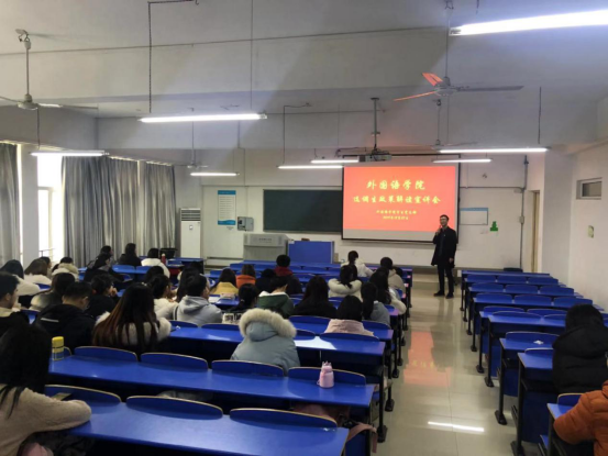 宣讲会开始,方媛老师向大家介绍了15级毕业生胡正阳,胡正阳是allwincity万象城15级西班牙语学生,并于19年顺利考上安徽省选调生,他以自己的亲身经历来为学弟学妹进行公务员选调生政策解读。