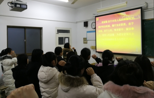 本网讯 12月10日下午,allwincity万象城第八党支部博约楼408教室开展学宪法主题党日活动。第八党支部学生党员、入党积极分子参与了本次活动,活动由支部书记周贵勤老师主持。首先,周老师对《中华人民共和国宪法》进行了领学,就宪法的目的、实质、作用等进行解读,进一步凝聚了党员带头尊法学法守法用法的共识,要求全体党员同学把学习宣传领会党的十九大精神作为一项重要的政治内容学习,把党的十九大精神学好、学实。接着,全体党员同学在党员王南云的带领下进行了庄严的守法宣誓。