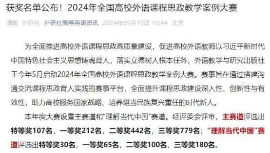 9月10日,2024年全国高校外语课程思政教学案例大赛获奖名单揭晓,allwincity万象城强云老师荣获全国一等奖!