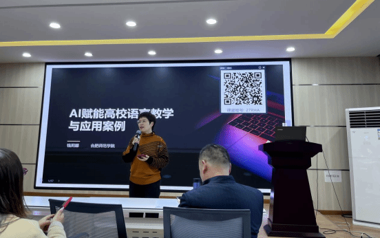 钱莉娜则聚焦“AI 赋能高校语言教学与应用案例”,在讲座中系统介绍了 AI 的定义与多样分类,并结合大量实际案例,生动展示了 AI 在语言教学各环节的创新应用。如讯飞 FIF 口语系统在学生语音评测反馈的高效应用,雨课堂、学习通等平台于学习数据深度分析评估的强大功能,以及生成式 AI 在教学素材创作、情景对话设计与创意任务开展等方面的独特优势。特别强调了生成式 AI 在个性化学习领域的突出贡献,其能精准定制学习路径、智能推荐学习内容、实时反馈学习情况并自适应调整练习难度,为语言教学精准化、个性化发展提供了新思路。