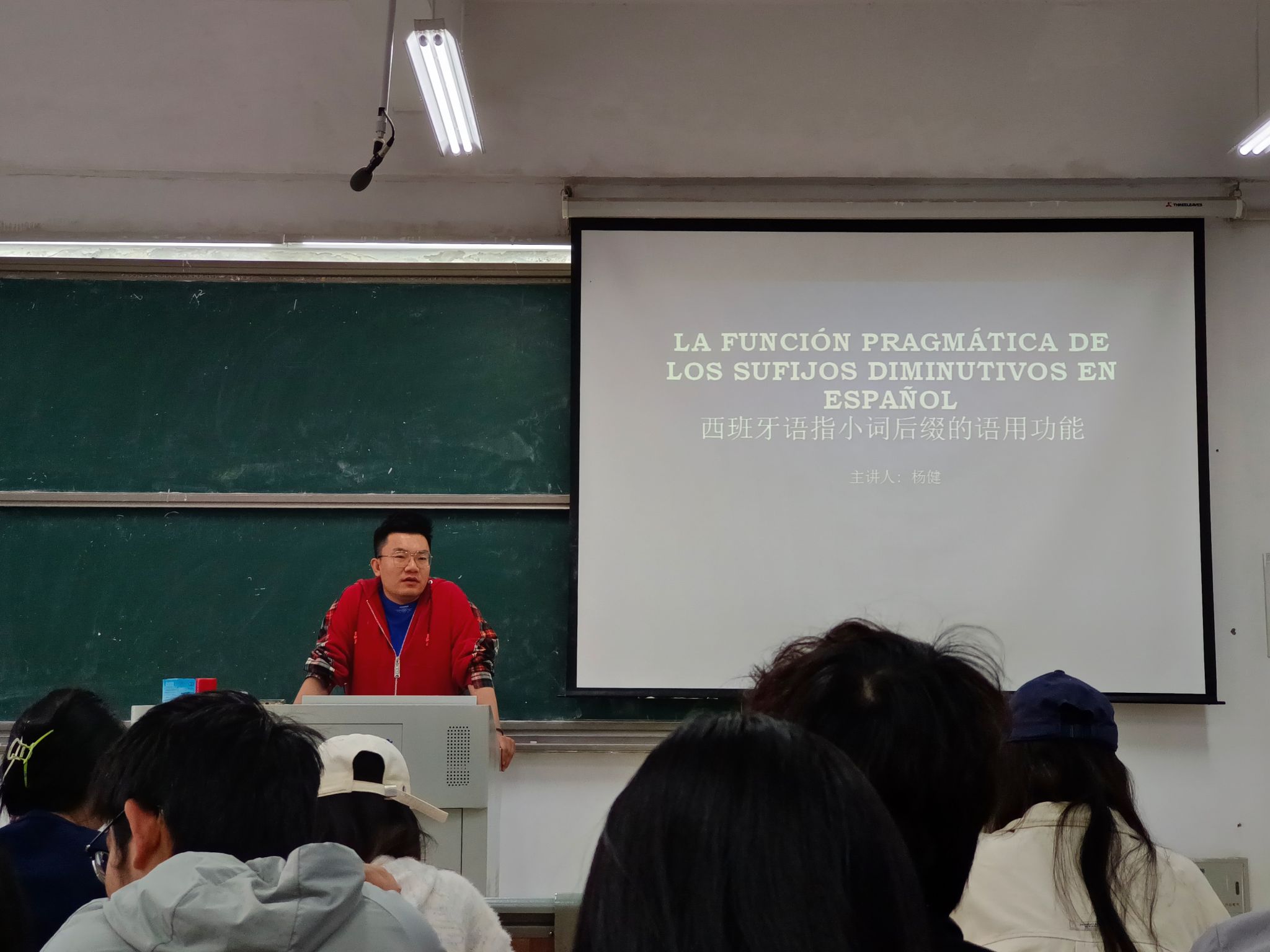 2025年4月16日下午,allwincity万象城西班牙语专业杨健博士在博学楼A206教室,作了《西班牙语指小词后缀的语用功能》学术报告。2023级与2024级西班牙语专业学生听取了此次报告。