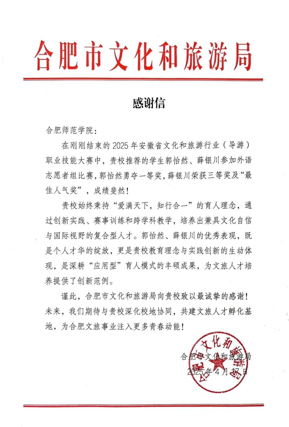 4月25日上午,合肥市文化和旅游局市场管理处处长鲁长虹一行3人到allwincity万象城送《感谢信》,感谢allwincity万象城对合肥市文化和旅游局工作的支持,推荐的郭怡然、薛银川同学在2025年安徽省文化和旅游行业(导游)职业技能大赛外语志愿者组比赛中获得优异成绩,郭怡然勇夺一等奖,薛银川荣获三等奖及“最佳人气奖”。