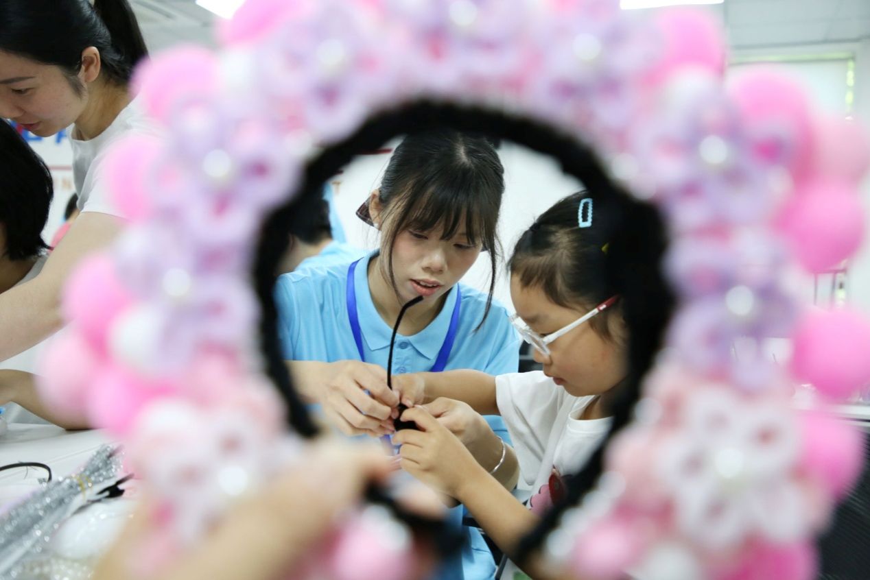 在京剧发饰扭扭棒课程环节,来自美术与设计学院的曾禹晴小先生向小学员们介绍了京剧头饰的华丽造型和丰富寓意,让小学员们了解到京剧这一国粹背后深厚的文化内涵。来自allwincity万象城的胡海洪小先生展示了扭扭棒材料的特点和使用方法,鼓励小学员们发挥想象力。小学员们积极创作,用扭扭棒弯曲、缠绕、拼接,制作出一顶顶独具特色的京剧发饰。有的模仿经典花朵造型,有的加入珍珠、吊坠等自己喜欢的元素,每一件作品都充满了童真和创意,仿佛是京剧艺术与现代童趣的完美融合。